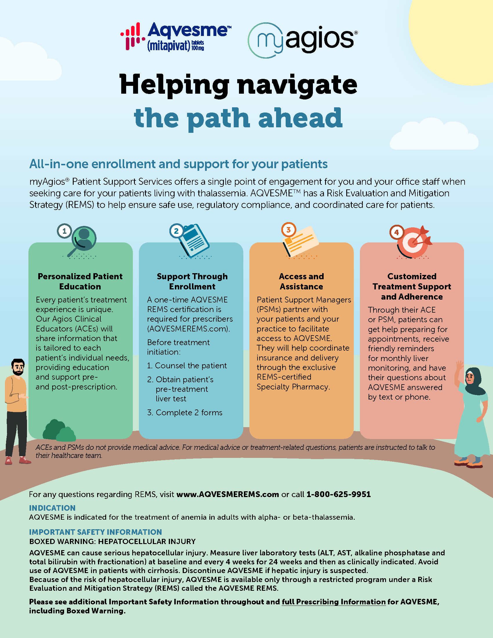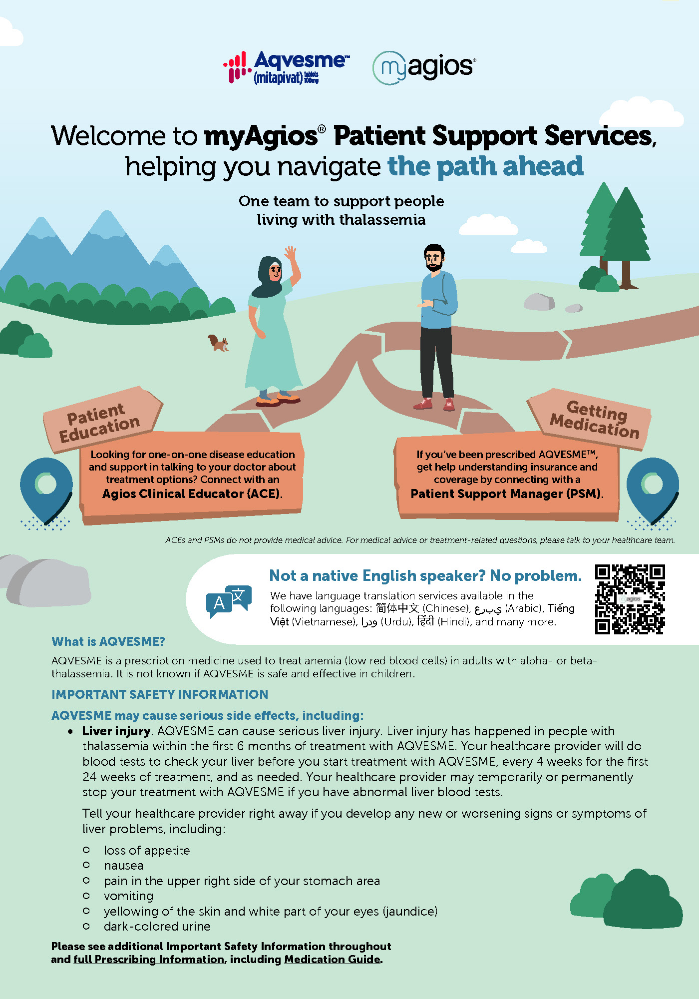 Symptoms and signs of early liver injury may mimic those of thalassemia. Advise patients to report new or worsening symptoms of loss of appetite, nausea, right-upper-quadrant abdominal pain, vomiting, scleral icterus, jaundice, or dark urine while on AQVESME treatment.